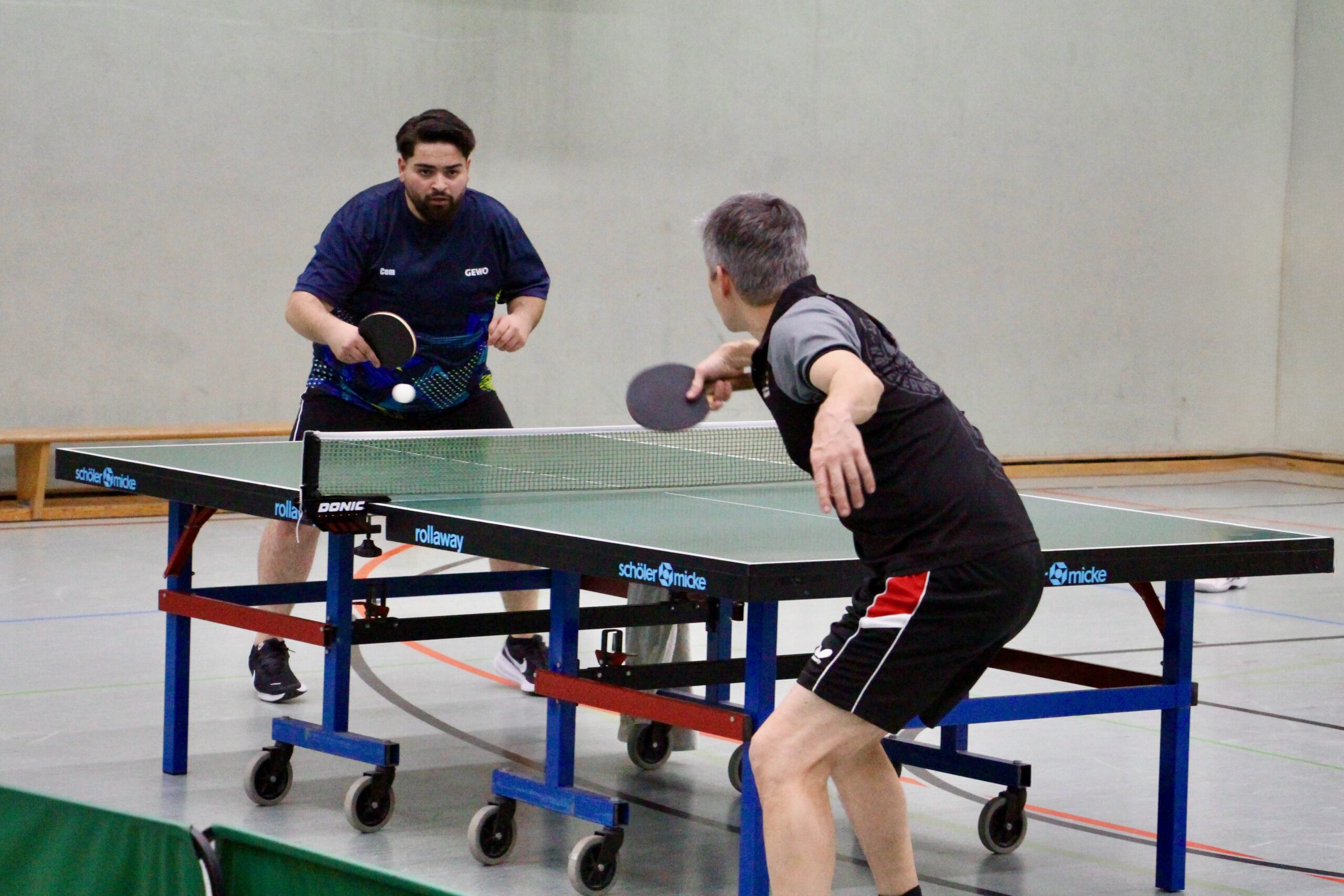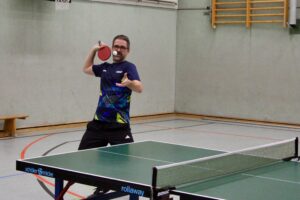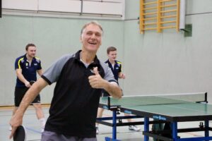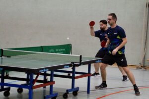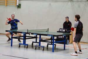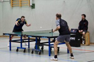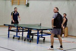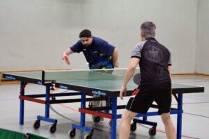 Eventmanager Schumi vertrat unsere Farben! Beide Teams gaben gleich Vollgas, die Folge waren Spiele auf hohem Niveau mit mehreren Wendungen! Getoppt wurde das Ganze nur noch durch die freundschaftliche und durchweg faire Atmosphäre! Beide Teams kennen sich gut! Den besseren Start legten die Hausherren hin: Daniel Schott und Florian Walny hatten unsere beiden Til(l)s überwiegend im Griff und stellten mit einem Dreisatzerfolg auf 1:0. Nebenan sah es nicht viel besser aus: Cem und Marcus lagen gegen Andy Oschem und Rene Miglitsch mit 0:2 hinten! Dann sprang der Motor an! Unsere beiden kamen zum Ausgleich und nahmen den Schwung mit in den letzten Satz! In dem schenkten sich die Kontrahenten nichts, denn auch Andy und Rene legten wieder zu. Mit einem überragenden Ballwechsel sollten sie am Ende mit 11:9 die Nase vorn haben! Die Gastgeber führten 2:0! Eine schwere Hypothek für unsere Männer, wie sich im weiteren Spielverlauf zeigen sollte!