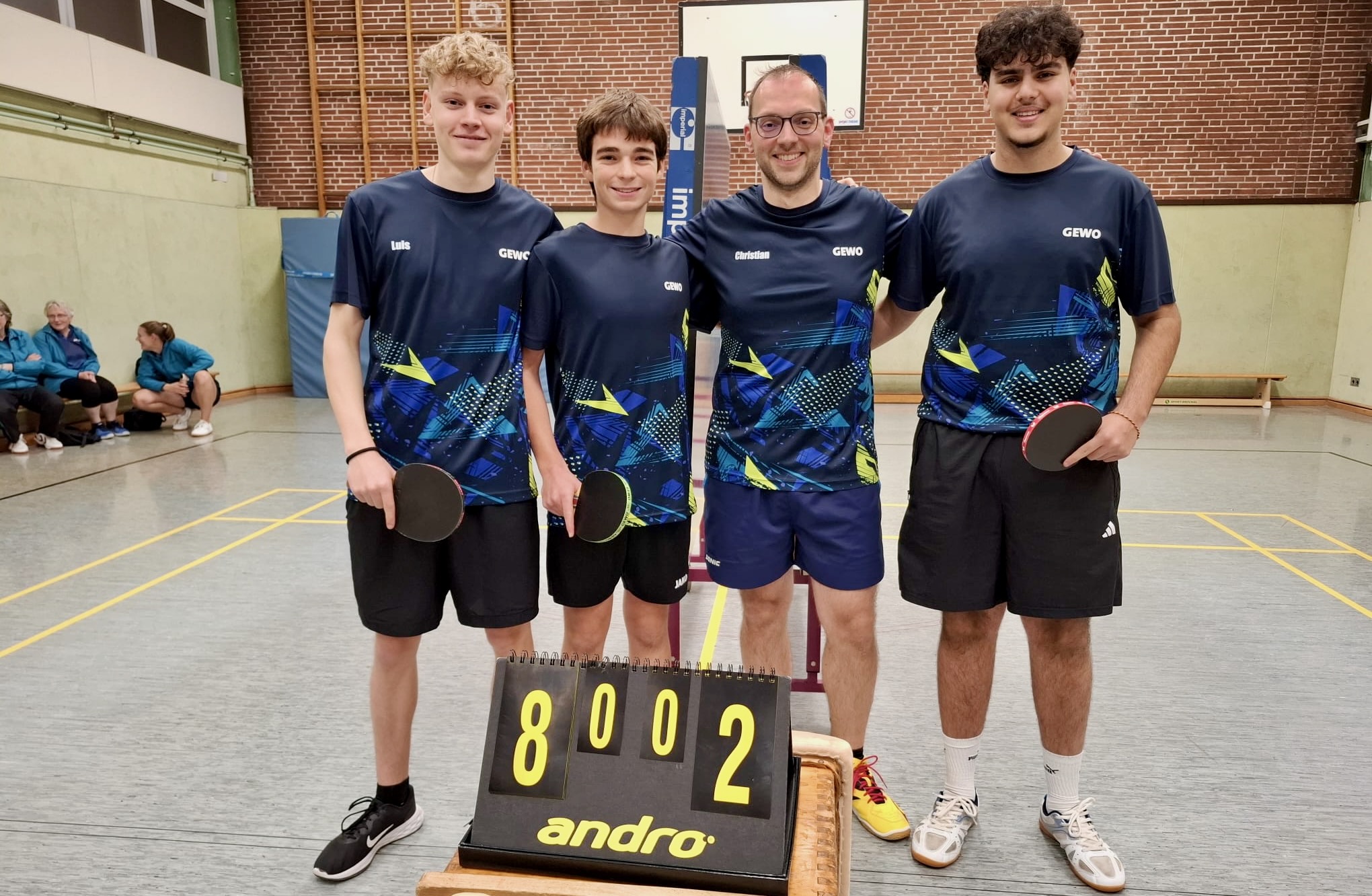 Eltze scheint ein gutes Pflaster für unsere 7. Herren zu sein! Innerhalb einer Woche mussten unsere Männer gleich zweimal die kurze Reise gen Osten antreten. Nachdem bereits die 3. Vertretung der Eltzer dran glauben musste, war nun auch deren 5. Mannschaft gegen unser junges Team machtlos. Arne und Luis legten im Auftaktdoppel in vier Sätzen vor, ähnlich klar setzten sich Merdan und Christian zur 2:0-Führung durch! Der Spitzenspieler der Gastgeber ließ mit seinem Dreisatzerfolg gegen Christian kurz aufhorchen, aber unsere jungen Wilden schienen nicht zugehört zu haben: Merdan (2), Luis und Arne ließen in den nächsten vier Einzeln einen ganzen Satz gegen sich zu, es stand bereits 6:1 für unsere Männer, der Sieg war schon in Sack und Tüten! Christian zeigte sich auch in seinem zweiten Einzel großzügig, hatte aber auch zweimal in der Verlängerung Pech! Arne und Luis fegten im Anschluss über ihre Gegner hinweg, der 8:2-Erfolg war am Ende mehr als verdient! Mit dem vierten Sieg in Folge und 13:3 Punkten zogen unsere Talente am TTC Eltze III vorbei und nehmen wieder die Tabellenführung der 4. Kreisklasse ein! Alles sieht nach einem Meisterschafts-Dreikampf aus: Unsere Männer müssen noch beim Tabellenvorletzten TuS Altwarmbüchen VII antreten und sind hier klar favorisiert, aber auch die Verfolger TTC Eltze III und TSV Burgdorf VII haben lösbare Aufgaben vor sich. Am Ende der Hinserie könnten gleich drei Teams mit 15:3 Punkten in die Winterpause gehen!