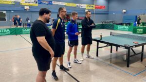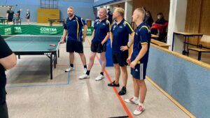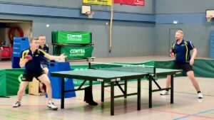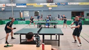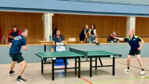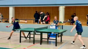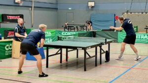 Nachdem bereits in der Ansprache Nettigkeiten ausgetauscht wurden, ging es vor der gut besuchten Tribüne endlich los! In unserer 1. Herren feierte Cem nach längerer Auszeit sein Comeback. Er sprang für den verhinderten Käpt’n ein. Die Nummer 1 fügte sich an der Seite von Marcus prompt gut ein: Die ersten beiden Sätze holten sich beide klar mit 11:6, bevor Jens und Schumi beim 17:15 im dritten Satz erstmals aufhorchen ließen. Aber der vierte gehörte wieder Cem und Marcus zur 1:0-Führung des Favoriten. Am Nachbartisch sah es anders aus: Jonas und Philip schienen die beiden Til(l)s im Sack zu haben, denn die ersten beiden Sätze holten sie sich in überzeugender Manier und im dritten hatten sie bereits mehrere Matchbälle! Die Spannung war kaum zu überbieten! Mit Glück und Geschick erzielten die Vertreter der 1. Herren mit dem 15:13 den Anschluss. Auch im dritten Satz blieb es eng, aber mit dem 11:9 kam es zum Satzausgleich! Nun ließen sich die beiden Til(l)s nicht mehr aufhalten und erhöhten mit dem 11:6 auf 2:0 für den als Gastgeber notierten Favoriten. Im ersten Einzel merkte man Cem zunächst den Trainingsrückstand an, denn Jens holte sich den ersten Satz. Danach kam Cem besser ins Spiel und holte sich beinahe ungefährdet die nächsten beiden Sätze. Der vierte blieb wieder eng, aber mit dem besseren Ende für die Nr. 1 der 1. Herren! Das 11:9 bedeutete bereits das 3:0! Vereinsmeister Jonas hielt die Hoffnung unserer 2. Herren hoch: Er verlor zwar den ersten Satz gegen Til, drehte danach aber auf und konnte sich wie schon bei den Vereinsmeisterschaften durchsetzen! Nur noch 3:1! Ging da noch was? Marcus holte sich im unteren Paarkreuz den ersten Satz klar mit 11:4 gegen Philip, danach verlief das Spiel ausgeglichen.