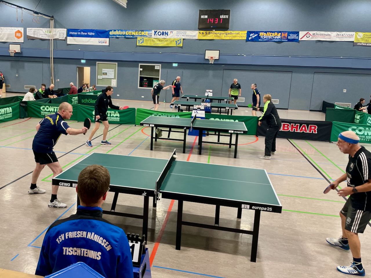 Mit seinem Dreisatzerfolg erzielte er den Ausgleich und gab damit das richtige Zeichen an sein Team! Es war schon beeindruckend, wie Schumi, Jens und Anti mit ihren starken Auftritten auf 6:3 für die Gastgeber erhöhten! Dennoch zeigte sich Engensen weiterhin widerspenstig und blieb auch in den folgenden Einzeln unangenehm! Im Spitzenspiel legte Gunter vor, die beiden Folgesätze holte sich aber sein Gegner. Der Käpt’n erzwang mit dem 11:6 den Entscheidungssatz, lief dort jedoch ständig einem Rückstand hinterher. Beim Stand von 8:10 und gegnerischem Aufschlag schien die Messe gelesen. Es sollte anders kommen: Nach vier abgewehrten Matchbällen stellte der Käpt’n mit dem 15:13 doch noch auf 7:3 für sein Team! Am Nachbartisch hagelte es zwischen Till und seinem Kontrahenten durchweg enge Sätze, aber wie schon im ersten Einzel präsentierte sich unsere Nummer 2 stark und erhöhte in vier Sätzen auf 8:3! Auch das nächste Einzel blieb eng: Marcus musste gegen Engensens Urgestein und unserem Jugendtrainer Herbert Fuhrmann in den 5. Satz! Hier bestätigte er aber sein starkes Nervenkostüm und sicherte den Gastgebern mit dem 11:5 den unerwartet hohen 9:3-Erfolg! Gemessen am Spielverlauf sicher ein bis zwei Punkte zu hoch, aber das kann den Hänigsern egal sein! Durch diesen Sieg weisen sie 7:11 Punkte auf und überließen den Relegationsplatz wieder dem TSV Dollbergen. Der weist aber nur einen Punkt weniger auf, sodass unsere Männer in der Rückrunde weiterhin auf der Hut sein müssen. Hier besteht die Hoffnung, dass zumindest Til nach seiner Verletzung wieder ins Geschehen eingreifen kann. Die Zahlen der Hinrunde lassen einen schon mal ins Grübeln kommen: Insgesamt 18 Ersatzgestellungen waren notwendig, 15 verschiedene Spieler kamen zum Einsatz, einmal trat unsere 1. Herren gar nur mit 5 Spielern an und 14 Doppelkonstellationen übertreffen sogar unsere 2. Herren! Schon erstaunlich, dass die Stimmungskurve in der Mannschaft nach einem zwischenzeitlichen Tief wieder deutlich nach oben zeigt! Und der versöhnliche Hinrundenabschluss sollte Mut für die Rückrunde machen!
