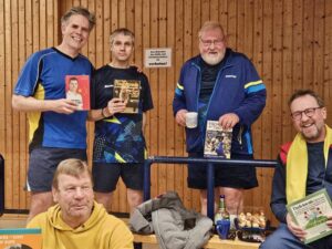 Einen etwas anderen Schwerpunkt schien unsere 6. Herren am gestrigen Tag gesetzt zu haben: Sicher ist, dass es nicht das Derby gegen unsere Nachbarn vom TSV Burgdorf V war! Vor dem Spiel lagen unsere Männer vor ihrem Gegner, was zumindest ein ausgeglichenes Spiel versprach, doch es sollte anders kommen: Bis zum 0:4 gelang den Gastgebern nicht ein Satzgewinn! Wo waren sie da nur mit ihren Gedanken? Jürgen und Otto versuchten es wenigstens und waren beide im vierten Satz dicht dran, doch auch sie sollten ihre Spiele vorentscheidend den Gästen überlassen. Danach ärgerte nur noch Martin seinen Gegner, aber ab dem vierten Satz ging ihm die Puste aus. Am Ende dokumentierte eine 0:10-Schlappe einen denkwürdigen Nachmittag. Fränki hatte da so seine eigene Wahrnehmung: „6. Herren verliert knapp mit 0:10 gegen Burgdorf und leiht sich demütig 5 Bücher aus unserer TT-Bibliothek aus!“ Wenn’s hilft… Dann folgte der eigentliche Schwerpunkt des Tages: Der Weihnachtsmarkt am Pappaul mit anschließender Feuerzangenbowle bei Sevda!🥳 Hoffentlich sind unsere Männer bis Freitag wieder durch, aber ein kleiner Zaubertrank könnte da nicht schaden: Dann geht es zum Tabellenführer der 3. Kreisklasse, dem TTC Thönse III! Bis dahin bleibt unsere 6. mit 8:8 Punkten auf dem 7. Tabellenplatz!